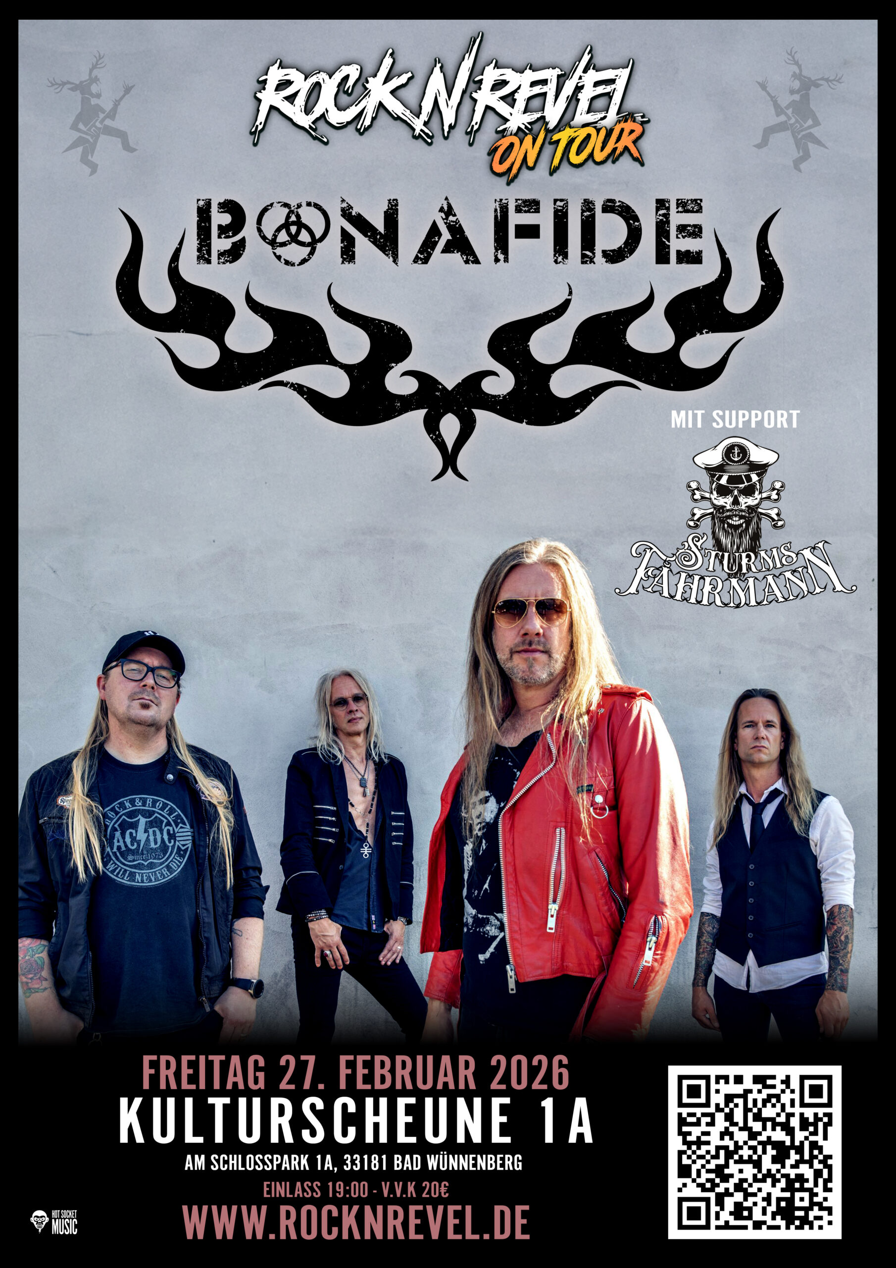 Neben dem jährlichen Festival am 11. und 12. September veranstaltet der Rockverein aus Altenbergen sein erstes Club-Event namens Rock ’n‘ Revel On Tour in der Kulturscheune1a mit den schwedischen Rocklegenden Bonafide und den Rock ’n‘ Revel-Favoriten Sturms Fährmann.